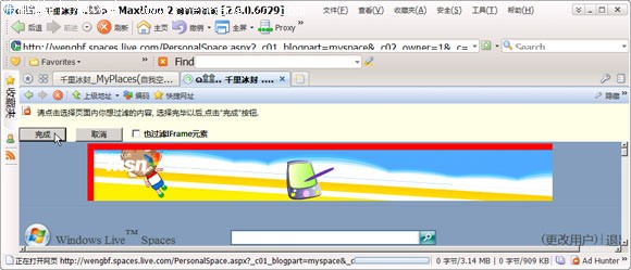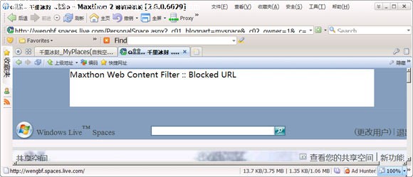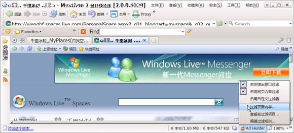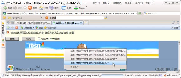 最近,MSN博客升级成Live博客,新的博客页面虽然更靓丽,访问速度也快了许多,但是在很多论坛都有关于用户抱怨Live博客的帖子。原来,新博客页面的页眉位置加了广告条,显得特别障眼,而且与博客整体风格有点格格不入。不过数分钟后,笔者轻松将广告逐出自己的视线,而且未经允许,广告条是不会擅自冒出打扰我们。要问笔者的秘密武器是什么,那就是最新版Maxthon,其页面内容过滤就是广告过滤的幕后英雄。 一、寻枪 下载安装Maxthon 最新预览版2.0.0.6363 下载最新发布的Maxthon 2.0.0.6363,根据安装向导一步步完成软件安装,然后点击相应快捷方式执行新版本。 二、使枪 广告过滤我自主 在Maxthon 2.0.0.6363访问自己的Live博客,页面打开后点击状态栏右侧的“AD Hunter”按钮,弹出的菜单选择“过滤页面内容”(如图1),此时该标签网页面顶部会冒出信息提示条。我们先别管它,在Live博客页面里左键点击广告条,弹出的菜单选择“过滤:http://×××××/*”(如图2),选择后广告条会以红色框框选中显示,表示此内容将被当选广告处理。