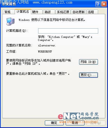 笔者最近为单位上开发一个B/S的管理信息系统,经常要在家里加班,单位上的SQL SERVER服务器和家里的SQL SERVER服务器安装的主机名不同,密码也不同,如果要用家里的SQL SERVER服务器来做项目的开发调试,就每次都要修改数据库的联接语句,很不方便,有没有办法在家里不重新安装SQL SERVER,构建和单位上一致的数据库开发环境呢?笔者通过一番思索,成功实现了上述前提条件使家里和单位上具有一致的数据库开发环境,现分享如下: 首先我们假定单位上的数据库服务器名为YCWCOM,登录密码为DB123456,家里的数据库服务器名为SLAVESERVER,登录密码为DB67890。 打开家里的电脑,右键单击“我的电脑”,选“属性”,找开系统属性对话框,点击“计算机名”选项卡,再单击“更改”按钮,我们的目的是要将家里的计算机名称由SLAVESERVER改为YCWCOM。