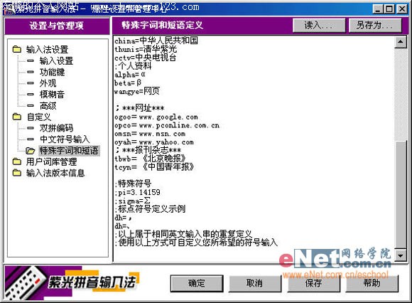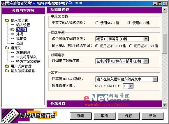 紫光拼音输入法是一款不错的汉字输入程序,而且可以免费使用。这里笔者愿和大家分享一些提高输入效率的经验,希望能对各位有所助益。 ×直接输入英文 程序提供有切换中英文输入模式的方法,在“设置属性”-》“输入法设置”-》“功能键”选项中,可以依据习惯选择使用SHIFT键或CTRL键来实现快速切换。不过还有更加简捷、快速输入英文的方法(见图1):先设定“功能键”-》“其它”—》“回车键功能”为“输入英文串”。之后在中文输入模式下,直接键入想要输入的英文字母,当屏幕上显示出对应的备选字或词时,不要按空格或数字键而直接按回车键,刚才键入的字母便会被原样插入到文本中。