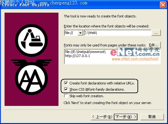 5.然后在"Create Font Objects"窗口(如图3), "Enter the location where the font objects will be created"一栏中指定生成的字体文件的路径,并且勾选上"Show CSS @ font-family Declarations",其它的使用默认值就行了;