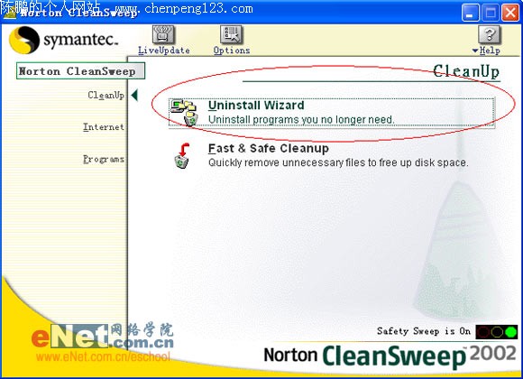 首先打开“Norton CleanSweep”客户端程序,选择左侧“CleanUp”选项后,单击编辑区内的“Uninstall Wizard”标签(如图1),进入到“软件卸载”对话框。然后在其下方“Select the program to uninstall”编辑区处,选择想要卸载的文件程序,单击“Next(下一步)”按钮,进入到“下一个”备份页面。这里只要单击里面“省略号”按钮,选择好指定备份文件的存放位置后,再次单击“Next(下一步)”按钮。此时编辑区就会提示“你是否要确认每一个要删除的项目”,选择下面“No”选项,单击“Next(下一步)”按钮直到“Finish(完成)”按钮结束,即可对其所选择的程序卸载和备份。