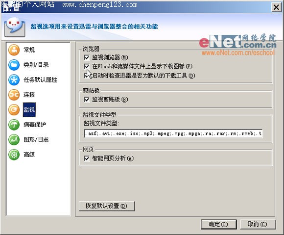 FLV是一种较新的流媒体格式,全称为Flash Video,现在很多的有名视频网站都采用了这种格式。但这种格式的文件不太容易下载获得,一般只在网上观看,给我们带来了不便。不过,现在有了新版的迅雷,我们不仅可以将这些FLV资源快速下载,而且还可以对其进行随意播放。 第一步:打开媒体感觉功能 首先要从http://www.xunlei.com上下载并安装最新的迅雷5,因为迅雷从5.5.2.252起才开始支持FLV视频的下载,只要不低于这个版本都可以。安装完成后,打开迅雷,选择“工具”→“配置”,在打开窗口中单击“监视”项,然后选中“在Flash和流媒体文件上显示下载图标”和下方的“智能网页分析”复选框(如图1)。