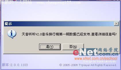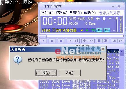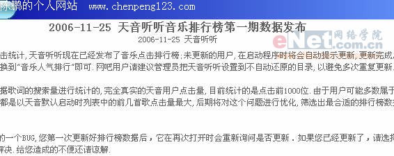 天音听听,不可不听!相信现在使用这款软件听歌的朋友已经不少了,它的十万首海量音乐和详细的音乐分类列表,都能让我们很快的喜欢上它。在天音听听新版的2.0版本中,有一个列表叫“音乐人气排行榜”,这是不少网友早就期盼的功能,但每次点击它,都显示“装载了0首音乐”,这是怎么回事呢?别急,我来带你破解其中的谜团。 打开天音听听,出现装载页面,这个与普通的没什么不同。天音听听的启动确实有点慢,不过这里我也能理解,因为它也和QQ之类的软件一样,有个登录服务器的过程,要去取得软件相关的信息,不然它无法正常运行的。 接下来,到了这个界面,一般的朋友都可能是发现了,但很郁闷的说光有个公告信息,但就是无法升级呀,这是怎么回事呢?别急,我们点“是”,然后进去其公告页面看一下。