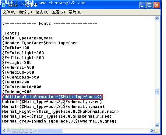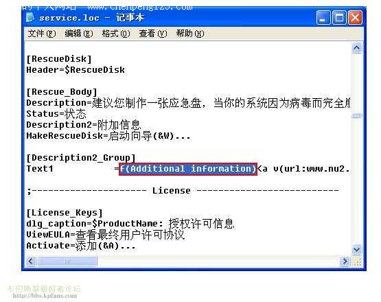 简体中文语言包为了保持原版风格、纯绿色和通用性的特点,不对文字设置进行修改。论坛上不断有人提问修饰“应急磁盘”选项里“附加信息”文字的问题,这里给大家介绍一种安全而且不影响英文界面显示的文字修饰方法,具体操作如下: 一、关闭卡巴斯基的“自我保护”,退出卡巴斯基。 二、打开安装目录下 skin 文件夹内的 skin.ini 文件,在其中增添“ Additional information=($Main_Typeface,9) ”如图(1) 。 三、用记事本程序打开 sch 文件夹内的 service.loc 文件,在其中增添“ f(Additional information) ”如图(2) 。 四、启动卡巴斯基,启用“自我保护”。