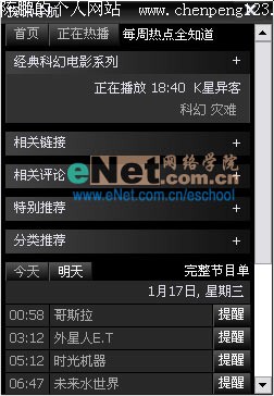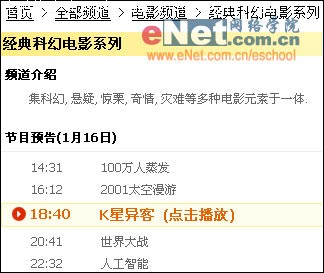 网络电视的出现极大的满足了影迷们的节目需求,但作为一个影迷最不能容忍的就是错过精彩节目,有什么方法解决这一问题吗?答案是肯定的,只要你安装了免费网络电视PPStream,我可以让它长长记性,帮你不再错过精彩的节目。 一、查询PPStream的节目单 我们在看电视节目的时候,经常收听节目预报,或者通过广播电视报的介绍才能知道具体节目的播放时间。其实免费网络电视PPStream也有一张这样的节目单,只是你不知道罢了。 打开PPStream的官方首页:http://www.ppstream.com。依次点击分类“全部频道>电影频道>经典科幻电影系列”,此时你将看到“经典科幻电影系列”频道的节目预告(图1)。