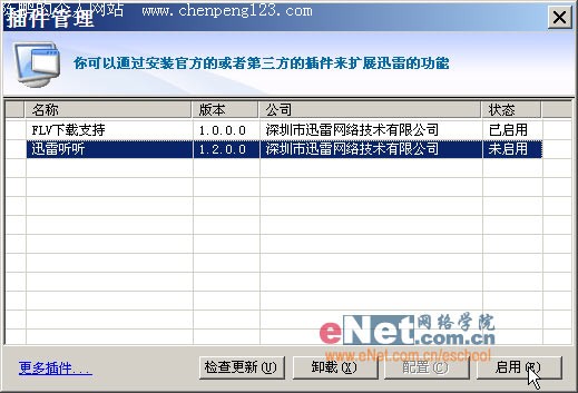 插件可以给程序带来更多的扩展功能,因此时下很多的程序都支持插件,迅雷也不例外。不过,你知道吗?我们可千万不要忽视了迅雷插件的管理。 1.启用/禁用插件 现在迅雷只有两个插件,一个是迅雷听听,一个是FLV下载支持。我们选择“插件”→“插件管理”后可以打开(如图1)所示的窗口,在其中可以选中某个插件,单击“禁用”将其禁用掉。如果我们禁用掉迅雷听听的话,则迅雷5主界面中的“迅雷听听”项将不复存在,同时“禁用”按钮会变为“启用”,再次单击还可以启用之。该技巧适用于日后插件较多时或者我们对某些插件根本不需要使用时,禁用掉部插件可以加快迅雷的启动和反应速度。