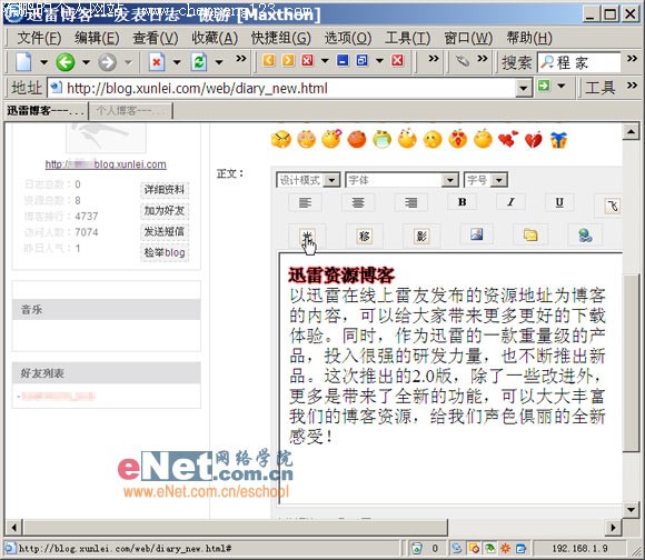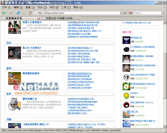 迅雷资源博客以迅雷在线上雷友发布的资源地址为博客的内容,可以给大家带来更多更好的下载体验。同时,作为迅雷的一款重量级的产品,投入很强的研发力量,也不断推出新品。这次推出的2.0版,除了一些改进外,更多是带来了全新的功能,可以大大丰富我们的博客资源,给我们声色俱丽的全新感受! 1.支持Firefox浏览器 Firefox的普及程度是众人所知的,其以安全、快速等特点而获得了很多的用户,发布当天即产生了200万的下载量,而微软的IE7也不过300万。而且,Firefox用户还非常忠诚,很多人都在使用。有幸的是,这次的迅雷博客也提供了对Firefox浏览器非常好的浏览兼容支持(如图1),这样Firefox的用户也可以在Firefox浏览器中使用博客功能了。