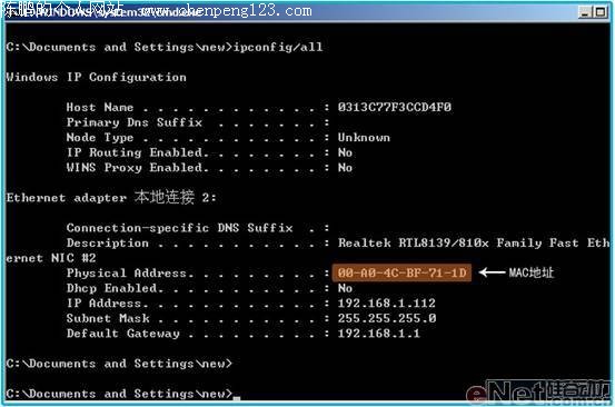 如果要修改网卡的MAC地址有好多的软件可以完成,今天我要给大家说的是在操作系统下自已手动修改网卡的MAC地址,很有用的啊!慢慢看下去吧。 例如:现在要把A机器的MAC,修改成B机器的MAC。 第一步:首先在B机器上查出本机的网卡MAC。在命令提示符下输入Ipconfig/all如图1, 记下来之后备用。