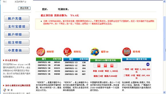 很多朋友都喜欢买彩票,而以前为了买彩票,必须要到彩票投注站去购买,无论是刮风还是下雨,如果你想买,就必须得往返于投注站。现在,使用支付宝,你就可以直接在家里买彩票了,是不是很方便。 第一步:确保你的支付宝账户的余额可以支付你想买的彩票金额,如果不够,请登录你的支付宝账户(https://www.alipay.com/),然后在右侧页面中点击“充值”按钮,然后在打开的页面中按照页面提示进行充值即可。 小提示:通过支付宝买彩票也是每注2元,因此充值时可根据自己想要购买的注数进行充值。 第二步:打开支付宝社区页面:http://club.alipay.com/index.htm,拖动滚动条,找到页面中与彩票相关的图标链接,直接点击彩票图标,这时需要你再次登录支付宝账户。 第三步:成功登录后将会直接打开该类型彩票的购买页面。如图1所示: