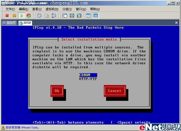 28.选择从什么地方安装,有两种方式:第一是CDROM(从光驱安装)也是这里使用的,第二HTTP是(从软盘安装).选择CDROM,点OK.