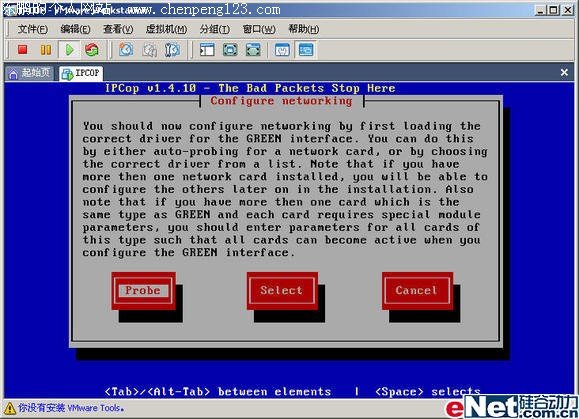 32.对内外网卡配置,选择probe让系统自动检测,回车.(Select是手工设定)