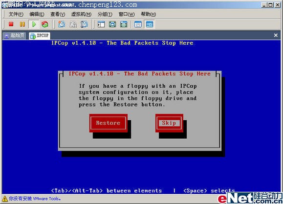 31.提示你有没有IPCOP系统的配置备份盘,有的话按Restore,没有的话按Skip.这里第一次安装,当然没有,选择Skip,回车