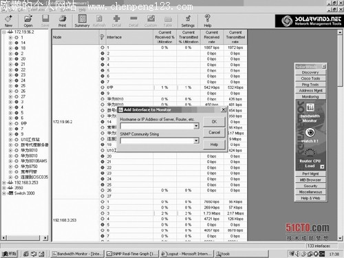 安装完该软件后,打开Monitoring项下的Bandwidth Monitor,再点击New按钮,在弹出的对话框中输入交换机的IP地址和Community密码,点击OK后即可显示出该交换机的各个端口。全部选中表示监视所有的端口,10分钟以后,每个端口的利用率和带宽情况就以具体的数字形式表示出来了。