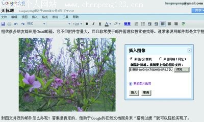 相信很多朋友都在用Gmail邮箱,它不但附件容量大,而且非常便于邮件管理和搜索查找等。通常来说写邮件都是文字格式的,但是在撰写邮件时却没有相关的插入图片的按钮,如果你想发一封图文并茂的邮件怎么办呢?答案是肯定的,借助于Google的在线文档服务来“搭桥过渡”就可以轻松实现了。 第一步:首先输入你的Gmail帐户登录到Gmail邮箱后,点击左上方的“文档”打开Google在线文档编辑器,依次点击菜单“New/Document”新建一个文档,然后就可以像平时写邮件那样开始编辑邮件的内容。 当我们需要在邮件里直接嵌入图片时,点击工具栏点选“插入/图片”弹出插入图片对话框后,点击“浏览”按钮选取一张你想插入的图片,可以是本地计算机的图片,也可以是网络上有绝对路径的图片,确定后即可将图片已经插入文档当中了(如图1)。