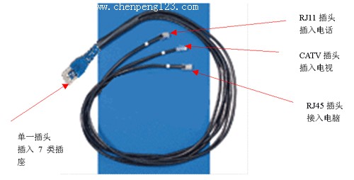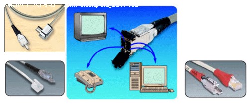 随着2002年ISO/IEC 11801 2nd Edition的发布,标志着7类(Class F)等级的布线系统正式标准化。7类布线系统采用线对屏蔽的S/FTP电缆,有效地抵御了线对之间的串绕,从而使得在同一根电缆上实现多个应用成为可能。 关于在7类布线系统上,实现一个端口(也就是在同一个插座上)实现多个应用(也就是连接多个设备:电脑、电话、电视等),各制造商提出各自不同的解决方案。 支持多重应用,尤其是CATV应用,需要862MHz的带宽。从这一点来说,标准定义的600MHz的接插件难以满足。而西蒙的7类系统支持最高达到1.2GHz(1200MHz)的传输带宽,足以满足语音、视频、数据等现有的应用需求。同时,要让语音、视频、数据信号在同一个信道传输,必须在电缆上实现线对屏蔽,接插件上也应该有相应的线对隔离措施,才能有效地避免线对之间的串绕的影响。 支持单个端口多重应用,有一个重要的问题是实用性。比如,六类及以下等级的插座,是否可以支持多部电话呢?性能上应该是可以使用的。但是,由于RJ45插座不能插入多个独立的插头,所以毫无实用性,所以并没有这样的应用。也就是说,必须具有多个应用组合的灵活性。 由于IEC的标准定义了“非RJ型”和“RJ型”两种不同的结构类型,其能够支持多个应用的解决方案也各不相同。 作为“非RJ型”接插件的代表,美国西蒙公司提供的TERA模块,标准号:IEC 61076-3-104。采用独特的4腔体设计,具有更高的灵活性和实用性。 一、 “RJ型”和其他类似的单一腔体的解决方案 单一腔体接插件的厂商提出,采用一头为单一插头(比如RJ45),另外一头带一个RJ11、一个RJ45和一个CATV插头的跳线,支持多个应用。跳线如下图: