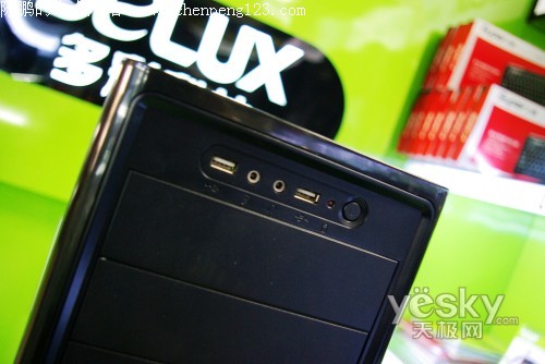 在机箱的前面板上设计有2个前置USB接口以及2个音频接口,方便用户即插即用设备的使用。