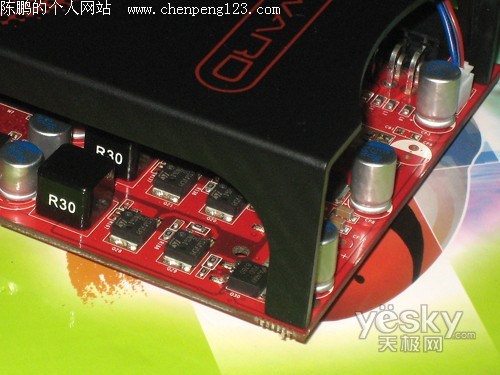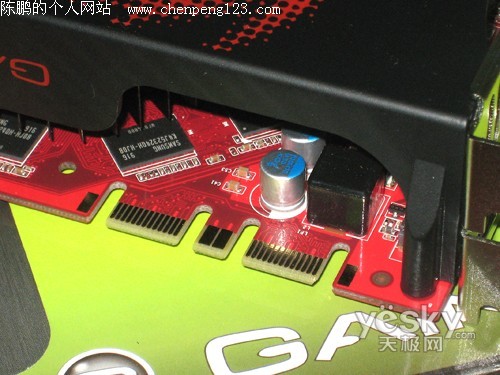 耕昇9800GT红旗H版显卡采用了3+1相供电设计,搭配全日系固态电容,每相搭配有三个MOSFET,且MOS管上覆盖了散热片,显卡提供了一个6PIN电源外接口,用于满足显卡供电需要,同时保证显卡稳定运行。