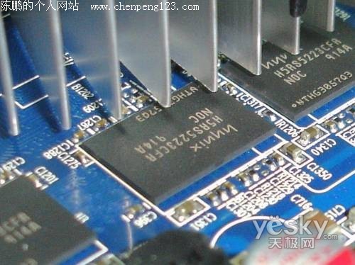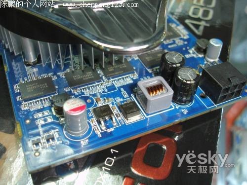 蓝宝HD4850海外版在蓝宝前几个RV770非公版的基础上继续优化PCB设计,在用料方面采用2+1相的高效独立供电系统,核心采用uP6201 PWM芯片配搭8个英飞凌高速Mosfet(均为PG-TDSON-8封装,每相两颗BSC042N03LS+两颗BSC120N03LS)、加上全屏蔽的电感和和全固态电容,为核心供电打下优良基础。