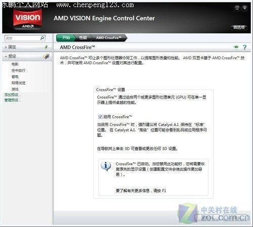 选择 性能 选项,然后选择AMD CrossFire 选项。将启用 CrossFire选项打勾即可完成。启用后并不需要重新启动电脑,直接可以使用。