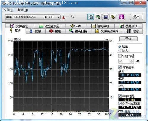通过测试我们看出,在HD Tune速度测试中,OCZ 40GB固态硬盘可以轻松达到180MB/S的速度,而传统机械硬盘仅为100MB/S。不过小容量固态硬盘由于容量偏小,所以通道数相应减少,在写入方面受到了限制,写入性能并不高。但是作为系统盘而言,写入速度并不起多少主要因素。