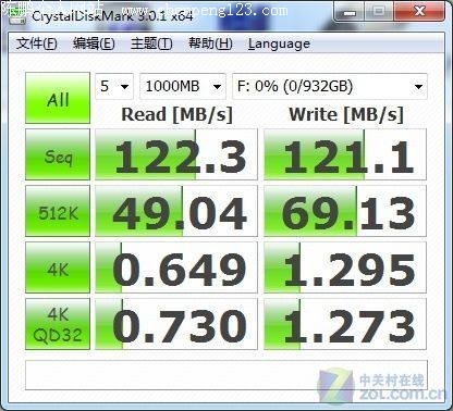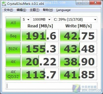 前面笔者已经提到了,虽然说机械硬盘一直在做着更新换代的工作,但是实际效果却不如人意,拿目前主流的希捷双碟1TB硬盘举例,读取和写入均在100MB/S上下,寻道时间12-15毫秒,可怜的4KB读写就更低的可怜。为此,从2008年开始,固态硬盘便出现在用户眼里。由于它是使用固态电子存储芯片阵列制成的硬盘,由控制单元和存储单元(DRAM或FLASH芯片)两部分组成,根本不存在任何机械装置,所以就免去了寻道时间这一概念。下面就是一款OCZ VERTEX2 40GB固态硬盘作为Win7系统的测试成绩。
