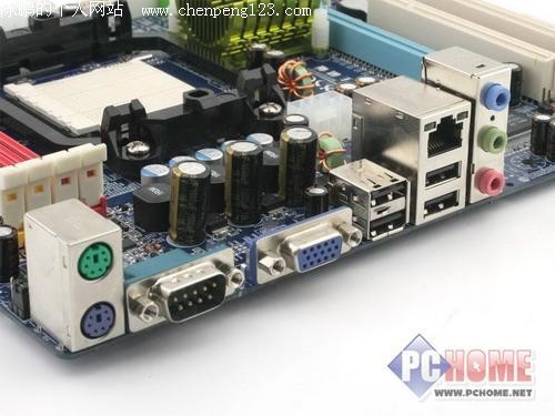 2:铭瑄MS-N61GL 299元 铭瑄MS-N61GL采用极具铭瑄特色的蓝色PCB,Mirco-ATX结构设计采用nVIDIA C61芯片组,支持AMD AM2接口处理器,支持1000MHz 的HT总线,提供4个DDR2 DIMM内存插槽,支持双通道DDR2 800/667MHz内存。内建GeForce 6系列显示核心,2条渲染管线、1个定点着色器,支持DirectX 9.0及 Shader Model 3.0特效,足以应付日常娱乐、学习等图形应用。 (图) 比清货还便宜 299元级白菜主板搜罗 与其它品牌不同的是,铭瑄MS-N61GL不因低价而偷工减料,而是采用中高档级别主板的用料。主供电部分,铭瑄MS-N61GL主板采用了主流的三相供电,用料相当扎实,采用了高品质1R0M全封闭式电感线圈搭配低阻值MOSFET,滤波方面前级使用了松下顶级的金装电解电容,后级则应用了性能十分强悍的Nichicon LF固态电容,有利于保证主板良好的稳定性。另外,供电部分位置设计在板缘处,安装维护起来会比较方便,并且不容易挡住处理器的散热风扇。 (图) 比清货还便宜 299元级白菜主板搜罗 背板接口,铭瑄MS-N61GL提供了1个VGA接口、4个USB2.0接口(最高可扩展为8个)、1个百兆网络接口、6声道的音频接口、1个PS/2口和1个串口,接口比较齐全,完全能满足普通用户的应用需要。