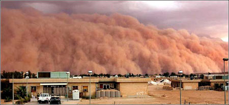 沙暴:4月26日,伊拉克与叙利亚和约旦的交界处,一起沙暴咆哮着穿过阿萨德沙漠。气象专家说这种延伸4000到5000英尺的沙暴十分罕见。