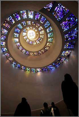 感恩的建筑:11月17日,美国德克萨斯州达拉斯感恩广场的感恩礼拜堂,人们望着闪耀光辉的窗户。