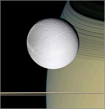 靠近土卫四:这是10月11日美国宇航局NASA的卡西尼号探测器拍摄到的土卫四的照片,不远处是土星的一部分。卡西尼在距土卫四310英里处飞过,显示土卫四表面多坑且没有大气层。