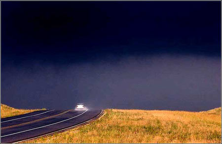 从背后打光:6月3日,美国德克萨斯州基林,在阳光的照耀下,一辆汽车行驶在201号高速公路上,轮胎在潮湿的路面上带起一片水花,远处正在乌云密布。