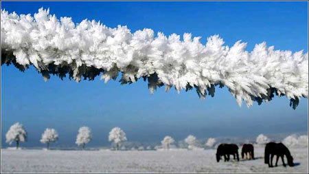 冰冻的围栏:2004年12月16日,德国慕尼黑西北25英里,马群在被冰冻了的围栏里。
