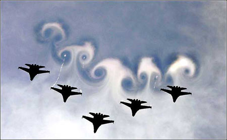 甩在身后的气流:7月30日,俄罗斯莫尼诺航空展,一个俄罗斯米格29战斗机编队在空中做列队表演。莫尼诺距莫斯科大约40公里。这次航展是为了纪念第二次世界大战胜利60周年。