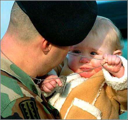 扯动心弦:美国士兵罗伯特·华莱士与自己9个月大的女儿Kelcey告别,他将从阿肯色州的查菲堡赶赴驻扎伊拉克。华莱士的部队将赴巴格达帮助训练伊拉克士兵。