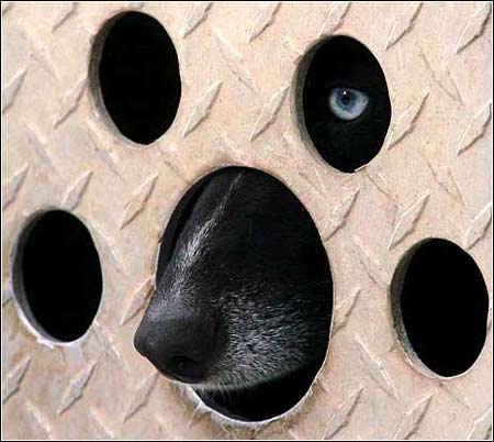 窥视:2月20日,美国小镇坎莫尔附近,一只准备参加国际狗拉雪橇比赛的狗从自己的窝里向外张望。北美最好的70支狗拉雪橇队伍参加了这次比赛。