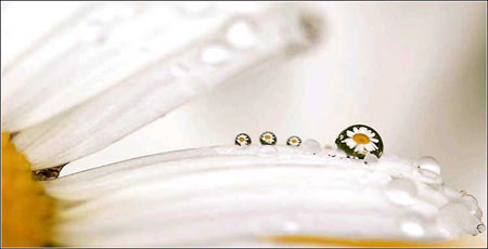 花样折射:6月14日,美国明尼苏达州,雨滴落在一朵春白菊上,花瓣上的水珠折射出许多朵春白菊。