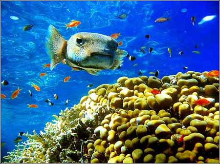 保护色:7月8日,埃及红海沙姆沙伊赫附近的拉斯·默罕默德保护区,一只密斑刺鲀游过珊瑚丛。为了保护自己,密斑刺鲀鼓起自己带刺的身体。