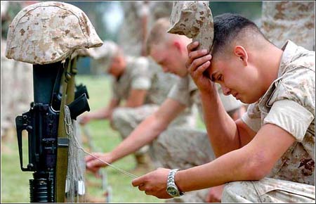 远忠诚:5月26日,美国加利福尼亚潘德尔顿营的一次仪式上,23岁的美国海军陆战队士兵Ben Flores抚摸着他的朋友William Salazar的标记牌,伤心落泪。Salazar是一名战地记者,在2004年10月伊拉克的一次自杀炸弹袭击中丧生。