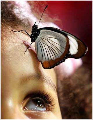 头顶上的小憩:10月5日,在美国纽约的美国自然历史博物馆的蝴蝶展室,3岁的卢拉·冈萨雷斯注视着一只停在自己头上的蝴蝶。