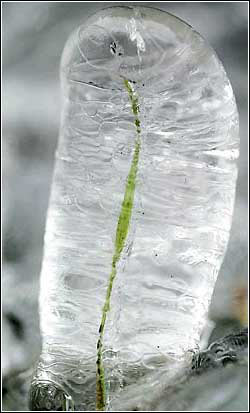 冰茧:1月6日,美国俄勒冈州的罗斯伯格,路边的一片草被冰块包裹着。