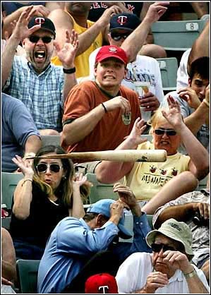 当心!:3月14日,美国佛罗里达州迈尔斯堡,明尼苏达双城队的Michael Restovich击球时不慎扔出的球棒。他们这场比赛的对手是佛罗里达马林鱼队。所幸没有人受伤。