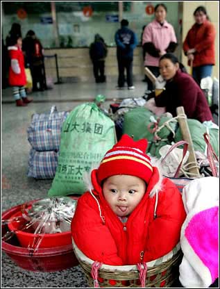 妈妈的背篓:1月25日,成都的长途汽车站,一个婴儿在竹篓里等待去买票的妈妈。每年的这个时候,人们都忙着回家团员过春节。