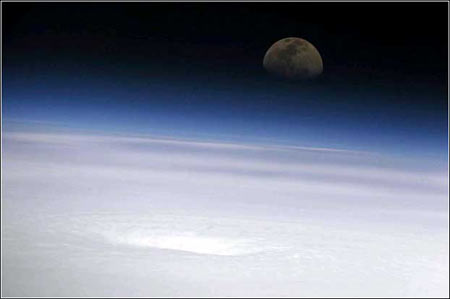 艾米莉的月晕:7月17日,美国宇航局的科学家约翰·菲利普斯从国际空间站拍摄下艾米莉飓风中心附近的月球。艾米莉飓风当时正位于墨西哥游卡坦半岛以东的加勒比海。