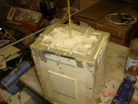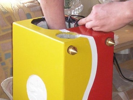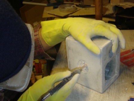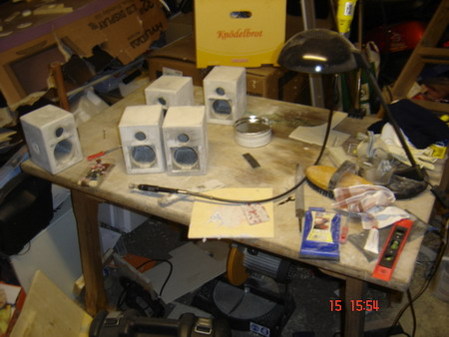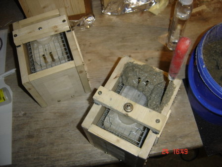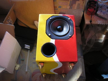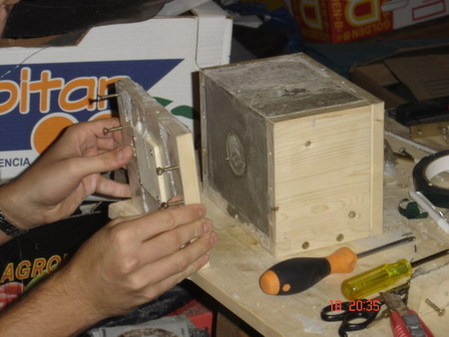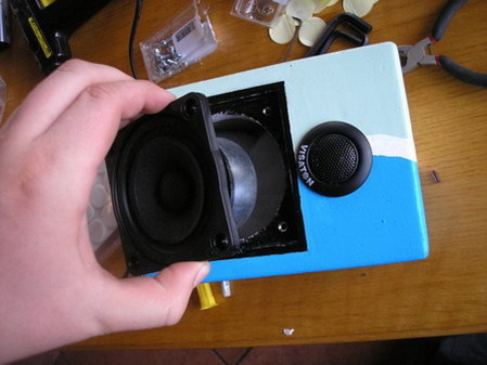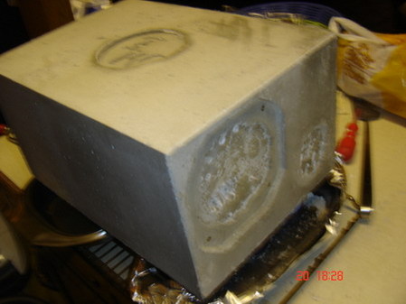 几位心灵手巧的德国朋友给我们带来了完全不同的作品,在设计了音箱的长、宽、高之后,他们首先使用腊和木头做出了制造音箱的模子,然后把由铁丝制成的骨骼放入其中,然后再把水泥注入模子,等到凝固之后把模子撤掉,然后在水泥表面刻logo、喷漆,这时音箱的箱体就宣告完工。之后的工作就是把各种电子器件和扬声器装入其中并固定好,最后封口。至此,一套完整的混凝土音箱就出炉了。