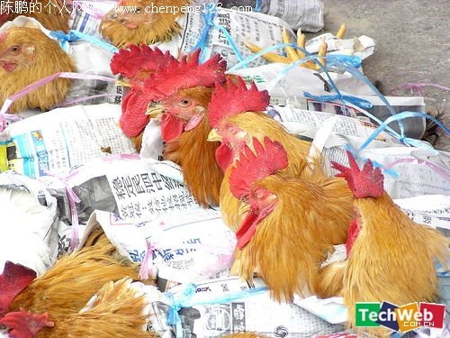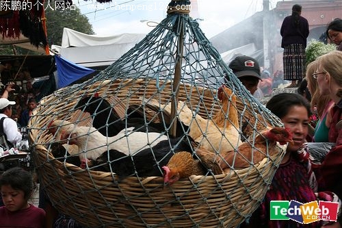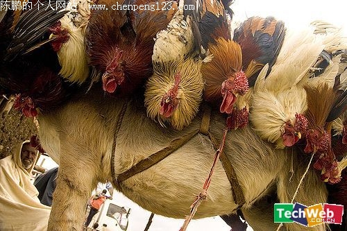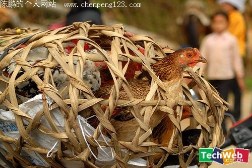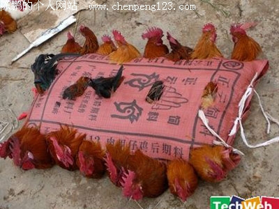 中国某地,使用一个大麻袋,然后剪出若干个洞,鸡脚绑在一起,然后塞进袋中。
