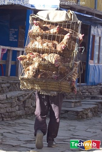 尼泊尔,人力运鸡法。