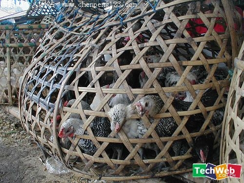 中国,竹笼运鸡。