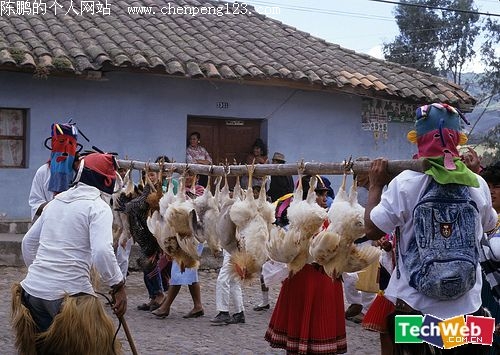 厄瓜多尔某地,大棒运鸡,还要穿上毛皮裤子,戴上面具。