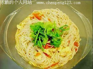 4、将调味料放面碗内,盛入面条,铺少许炒好的榨菜肉丝并撒葱花少许即成。
