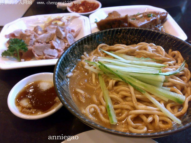 材料: 白斩鸡数块、面条、黄瓜、芝麻酱、麻油、糖各1大匙、酱油2大匙、辣椒粉适量