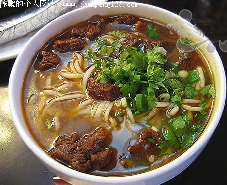 4、碗中放入麻油少许、葱花、牛肉汤,加入面条、青菜、牛肉即可。 特点: 香喷喷,好吃看得见。